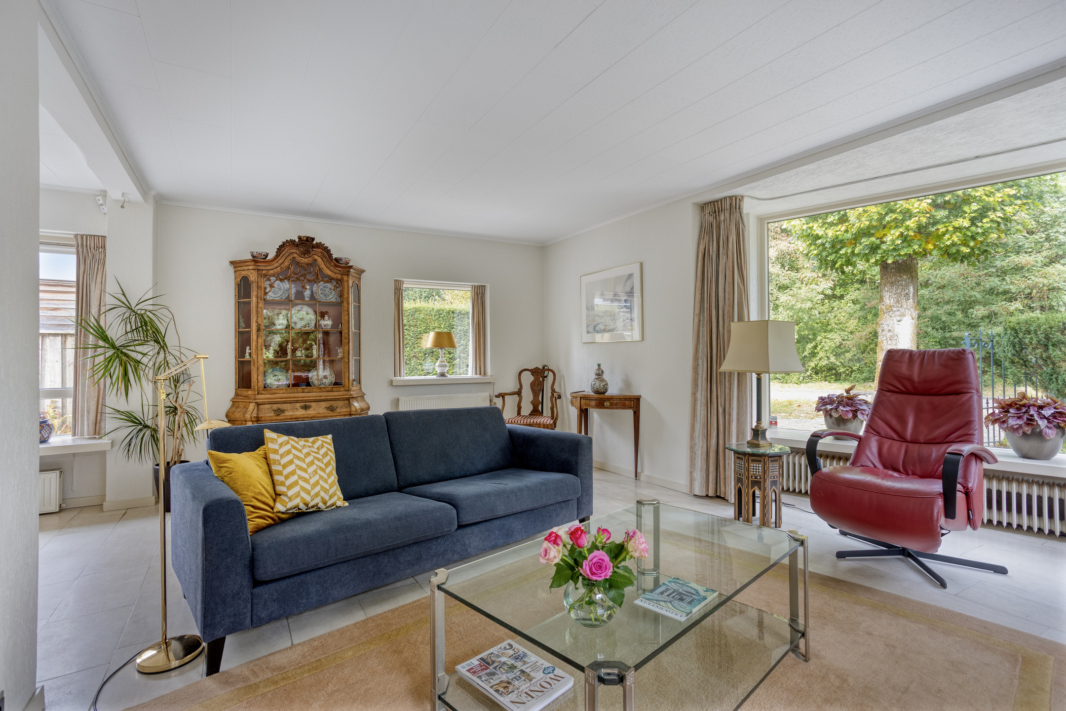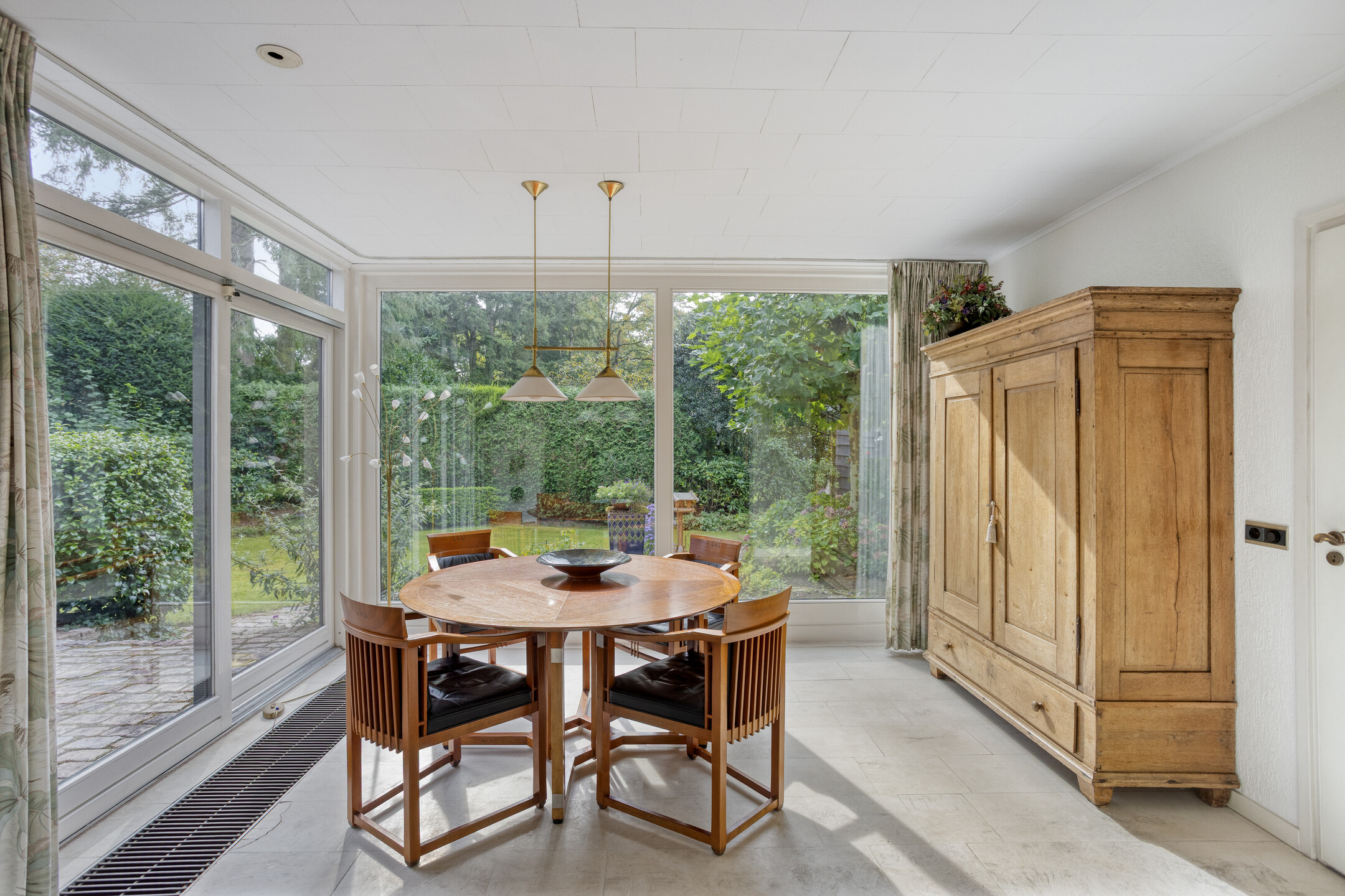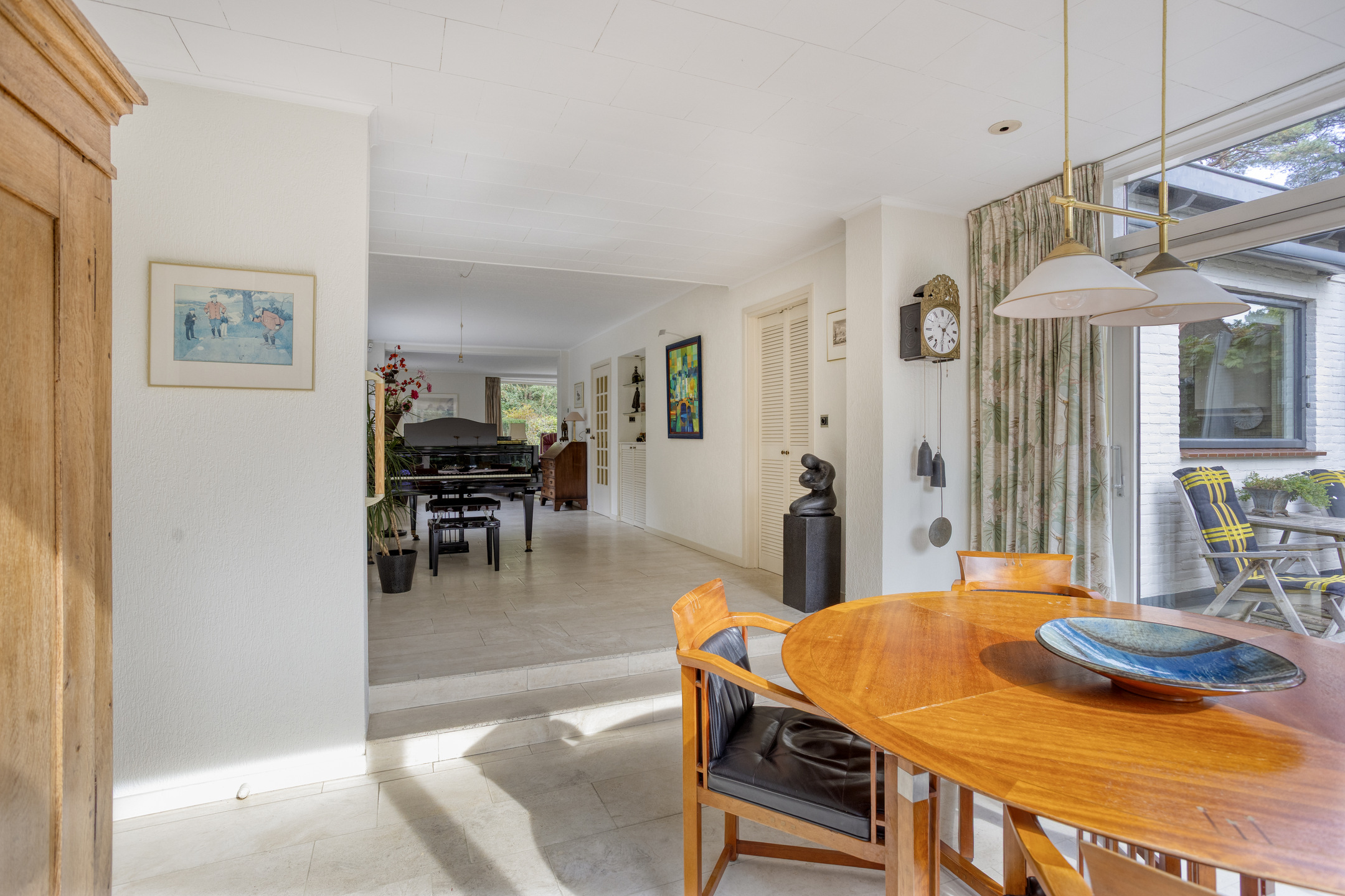 Entree aan de zijkant, hal, verdiepte kelderkast met meterkast, separaat toilet met fontein, ruime woonkamer met vloerverwarming en open haard, heerlijke uitgebouwde tuinkamer eveneens met vloerverwarming, mooie lichtinval en uitzicht op de achtertuin, royale dichte eetkeuken met aparte ruimte voor wasmachine en droger.