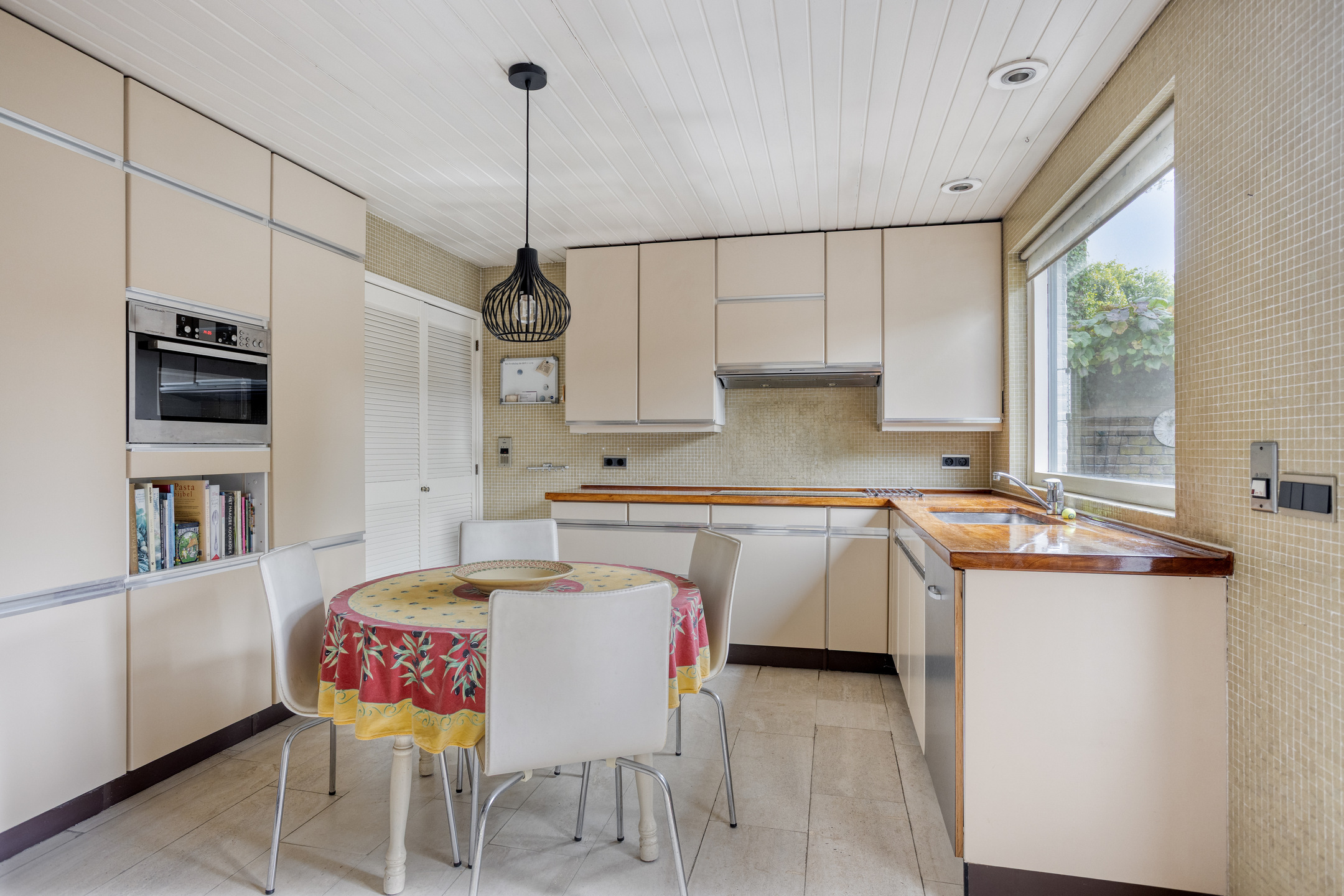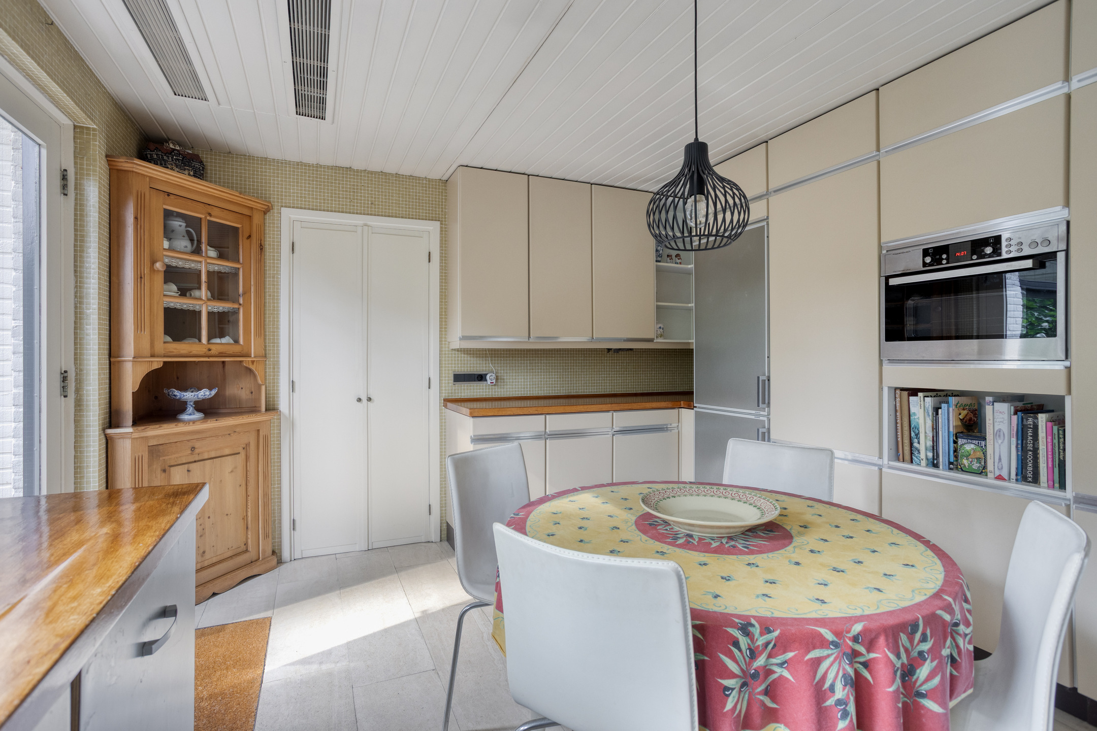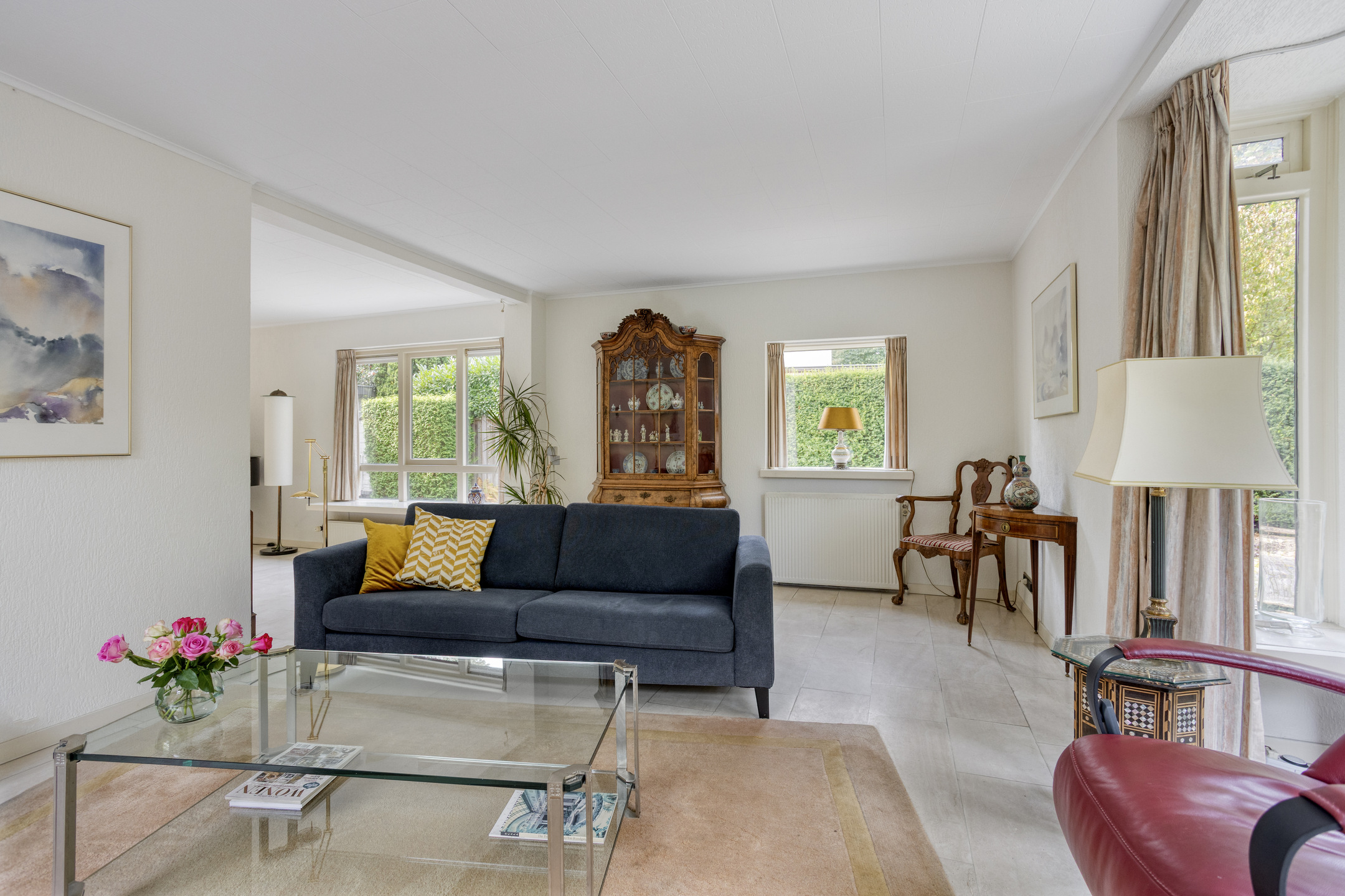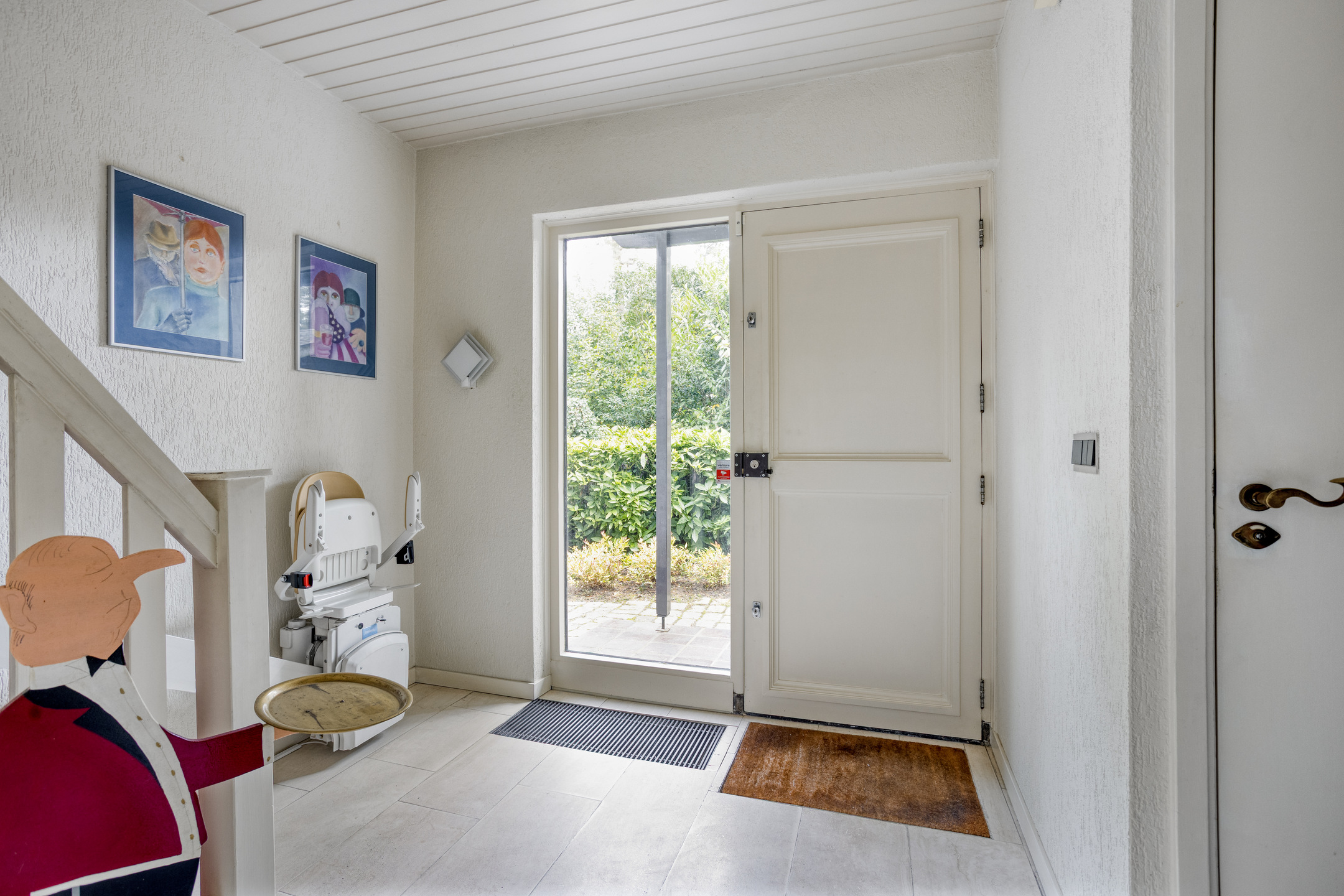 Entree aan de zijkant, hal, verdiepte kelderkast met meterkast, separaat toilet met fontein, ruime woonkamer met vloerverwarming en open haard, heerlijke uitgebouwde tuinkamer eveneens met vloerverwarming, mooie lichtinval en uitzicht op de achtertuin, royale dichte eetkeuken met aparte ruimte voor wasmachine en droger.