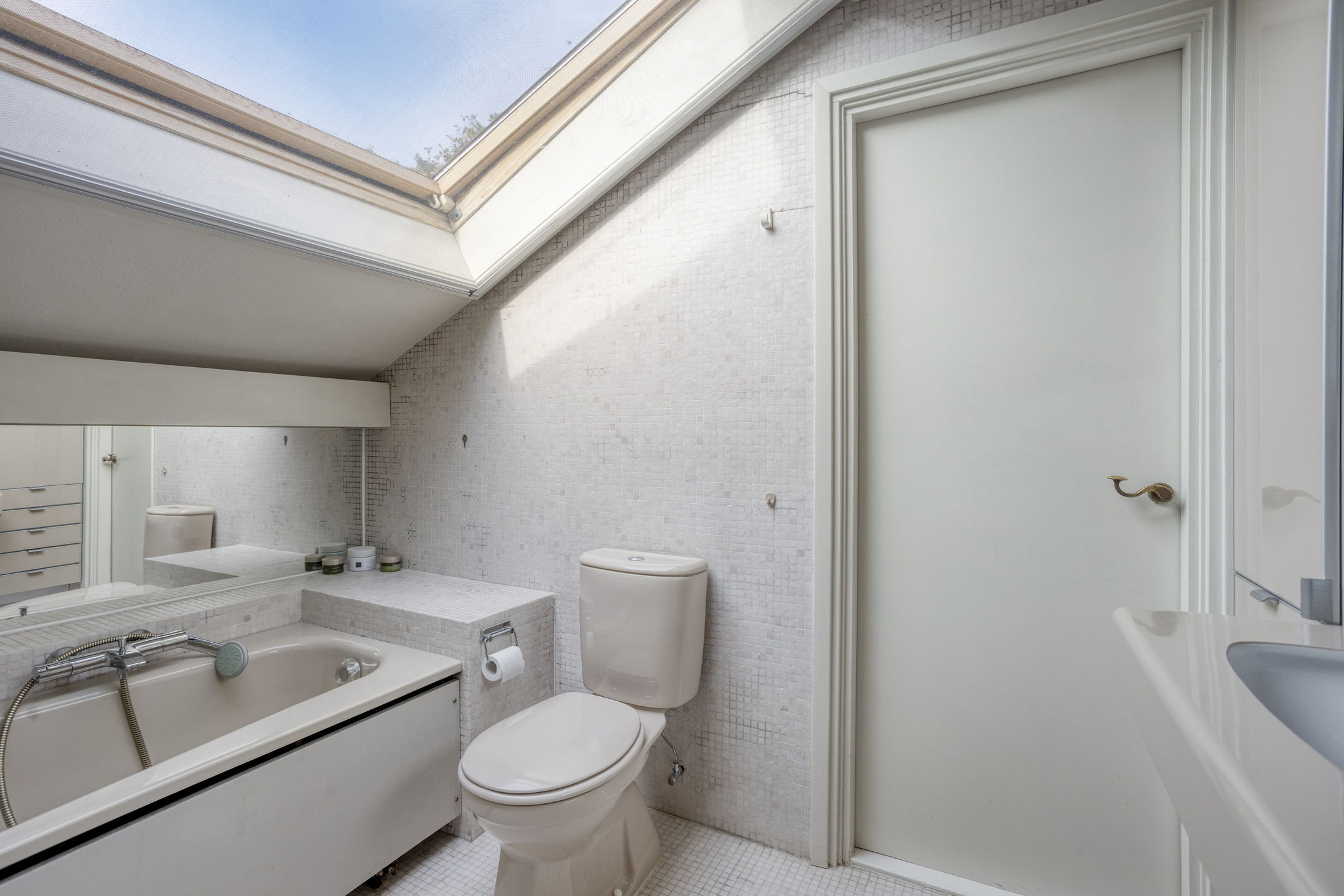 Overloop, slaapkamer achterzijde (voorheen 2 slaapkamers) met vaste kastenwand en wastafel, grote slaapkamer voorzijde met balkon, vaste kastenwand en badkamer met ligbad, toilet, douchecabine en wastafelmeubel met dubbele wastafel.
